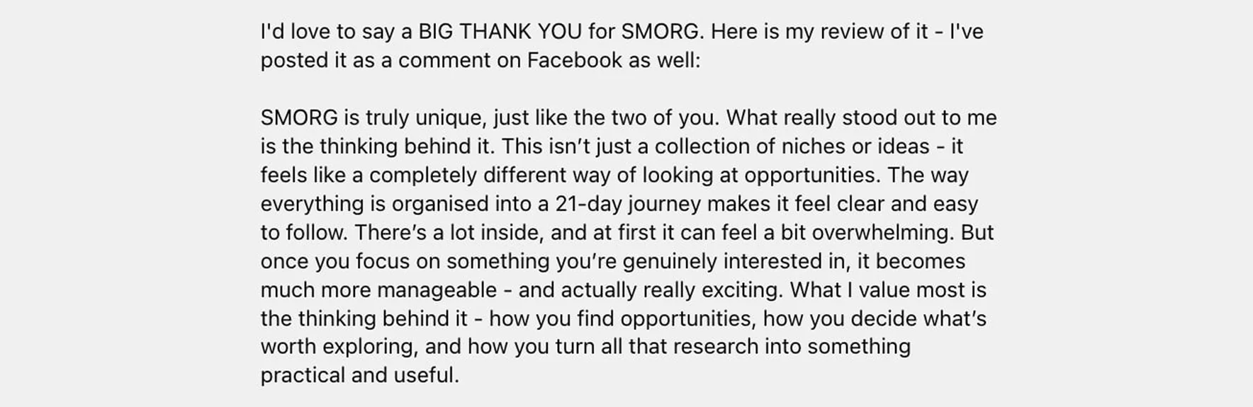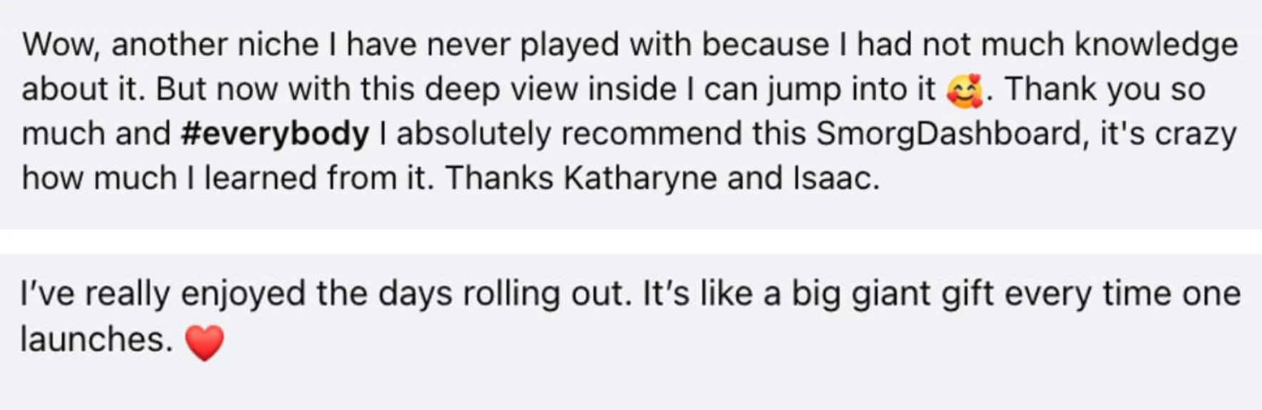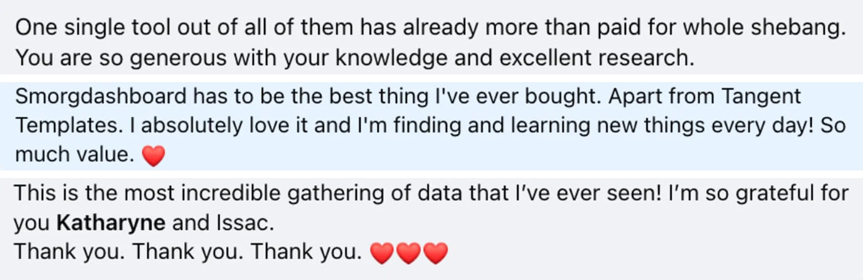 Each niche is packed with in-depth reports, beautiful and easy to use dashboards loaded with datasets, and innovative tools. There are 19 niches... Plus the Smorger’s Way course!