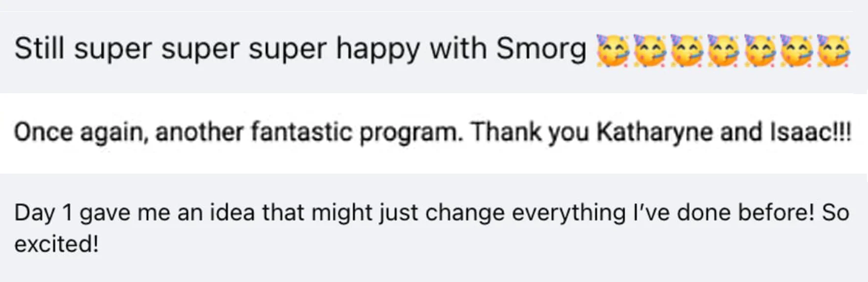 The last day is ‘The Smorger’s Way: We are all Artists. We are all Imposters’ — an interactive course that turbocharges your creative entrepreneurship skills through Katharyne’s favourite frameworks.